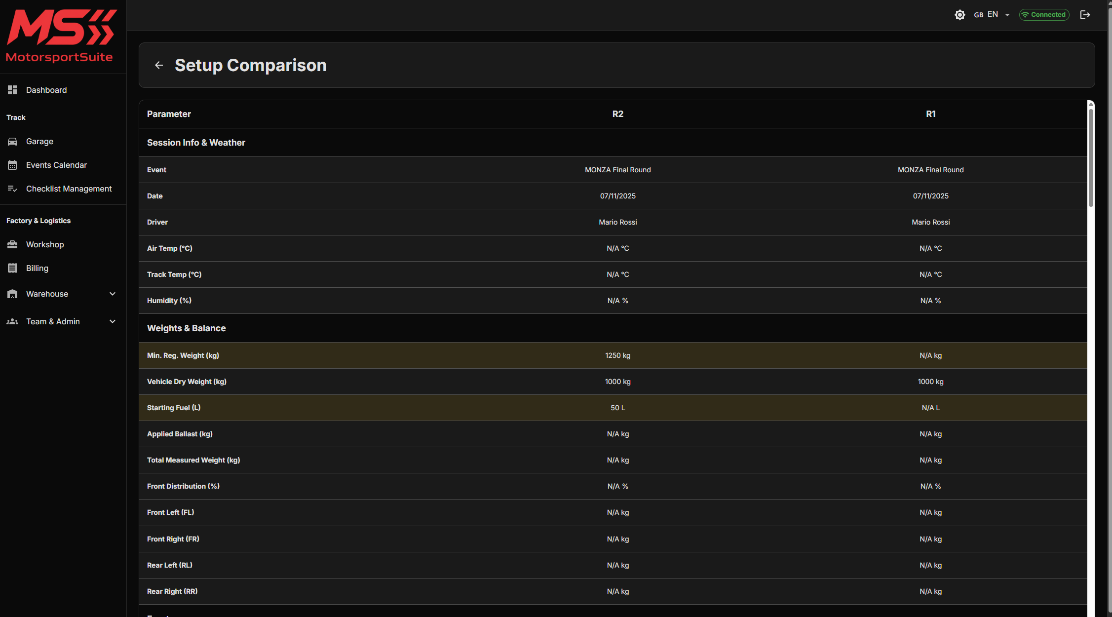 During sessions, access a view optimized for the pit wall. See essential data, driver notes, and targets in real-time.