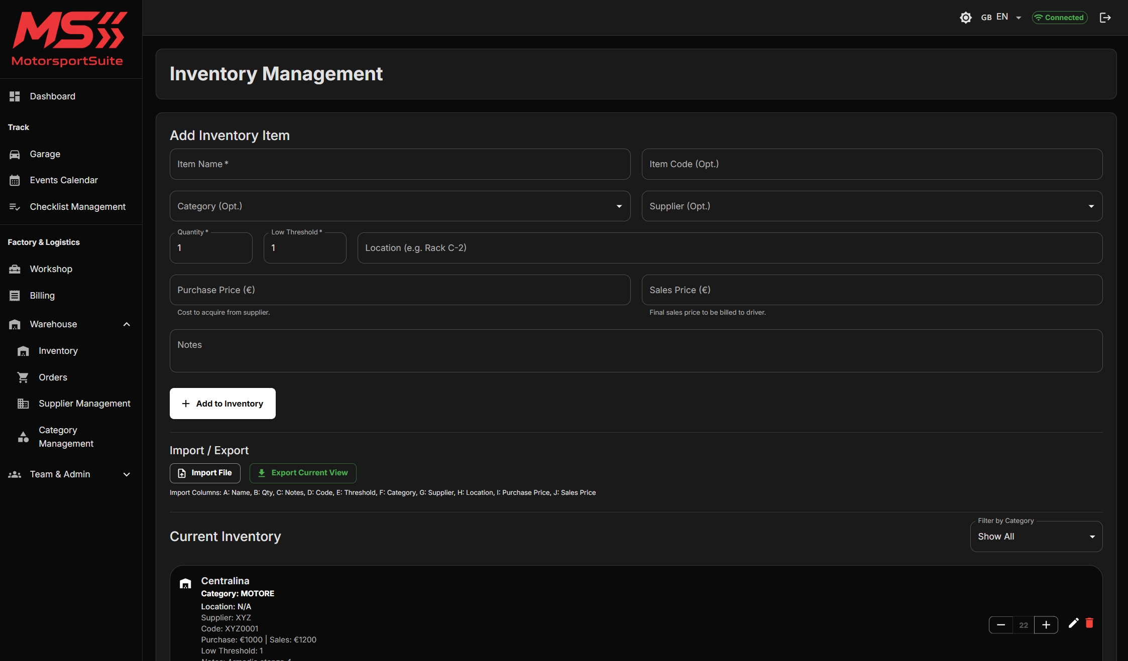Manage your inventory, part categories, supplier orders, and minimum stock levels.
