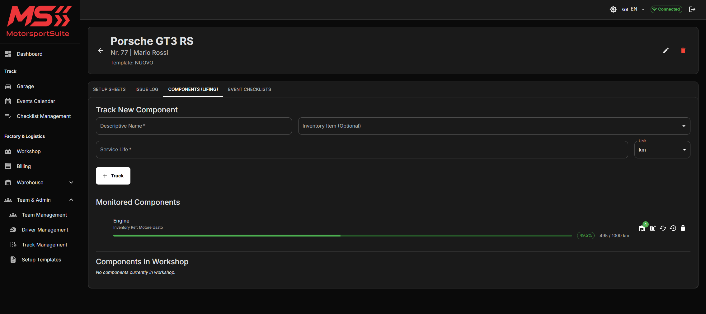 Don't risk a DNF. Track component wear (engine, gearbox, brakes) by laps or km. Get automatic alerts.